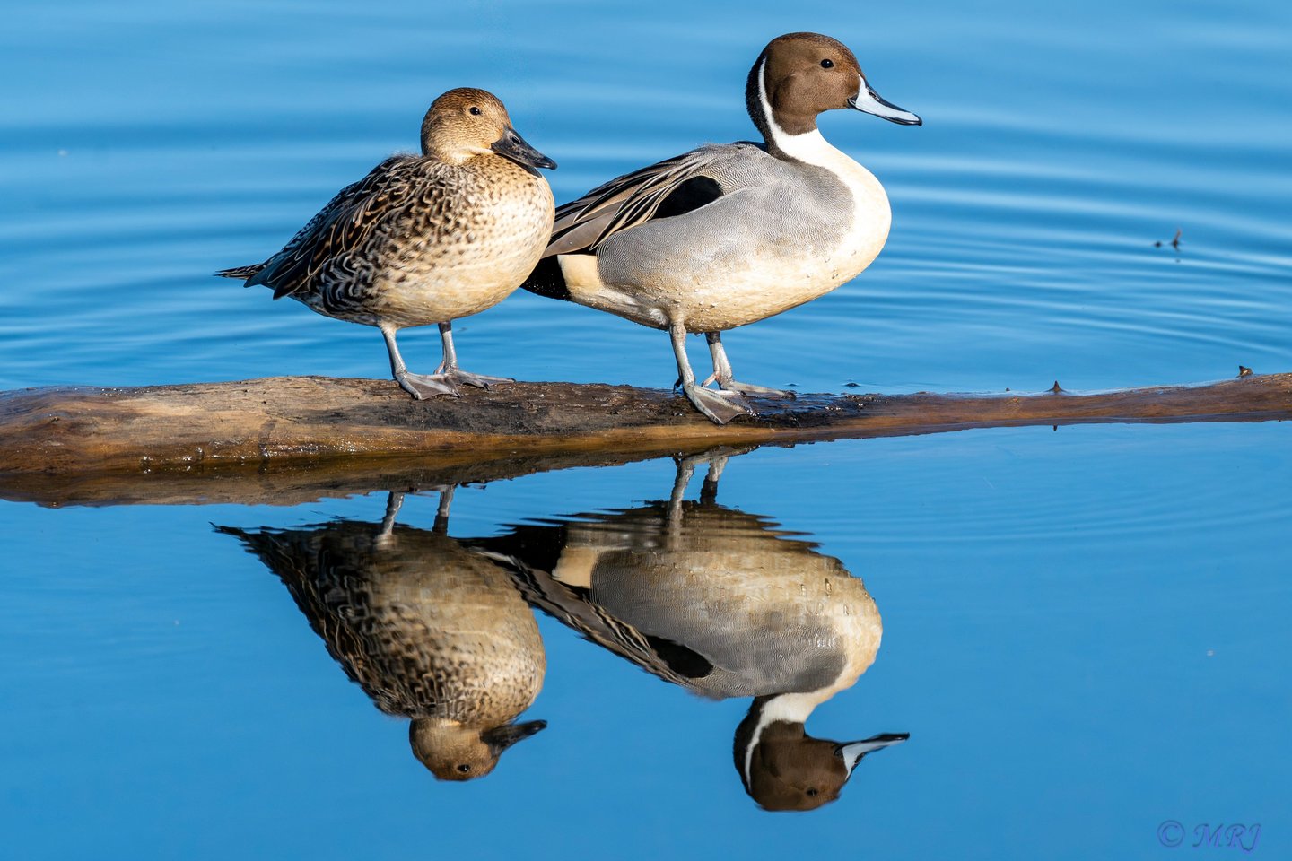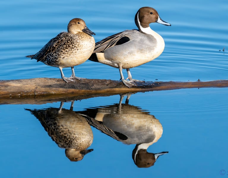 A male and female Northern Pintail (Anas acuta) stand in perfect profile atop a floating log. The calm, deep blue water creates a flawless mirror image, capturing the drake’s elegant white neck stripe and the hen’s intricate plumage. A serene moment showcasing the natural symmetry and beauty of waterfowl.