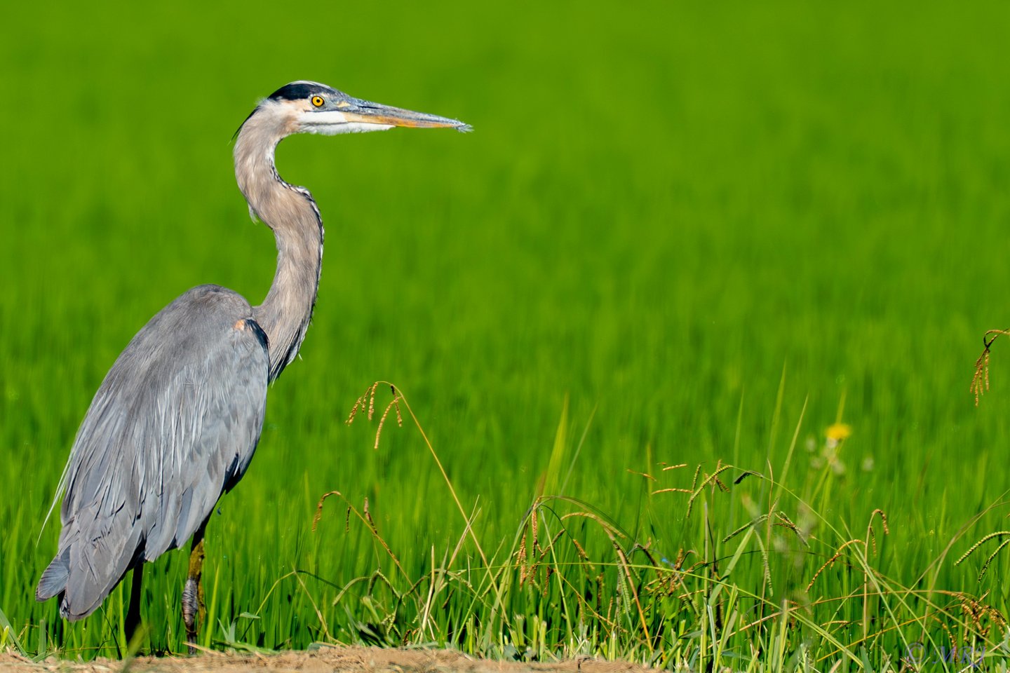 On a return visit to Colusa National Wildlife Refuge, one of our favorite spots, we were fortunate to capture this photo of a Great Blue Heron pausing from its hunting. The largest heron in North America, the Great Blue, is distinguished by its long legs, sinuous neck, and thick, dagger-like bill. Its head, chest, and wings display distinctive, shaggy plumes.