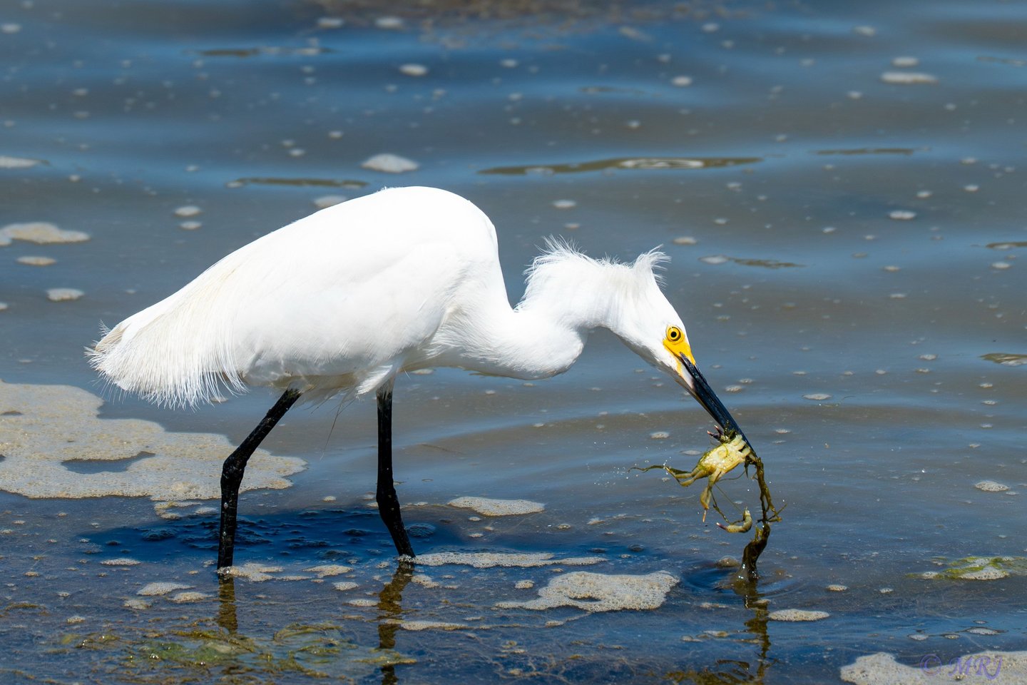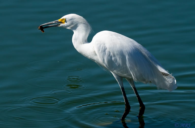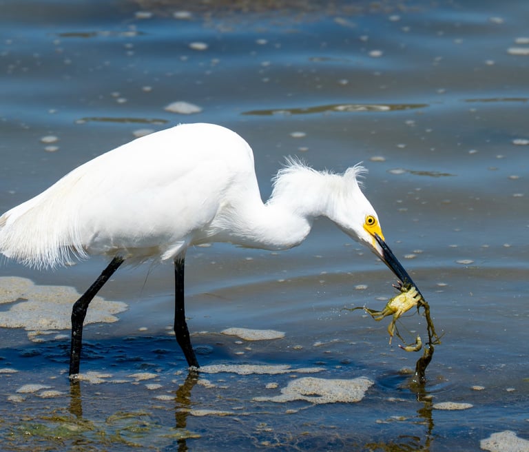 Loch Lomond Marina is a fantastic spot for wildlife, and we recently caught a magnificent sight: a Snowy Egret on the hunt! It was incredible to watch this beautiful, active bird snag a crab for its meal. Snowy Egrets are small, graceful birds often seen darting through shallow waters. Their all-white bodies, black bills, black legs, and vibrant yellow feet make them easy to spot, along with a distinct patch of yellow skin where their bill meets their face.