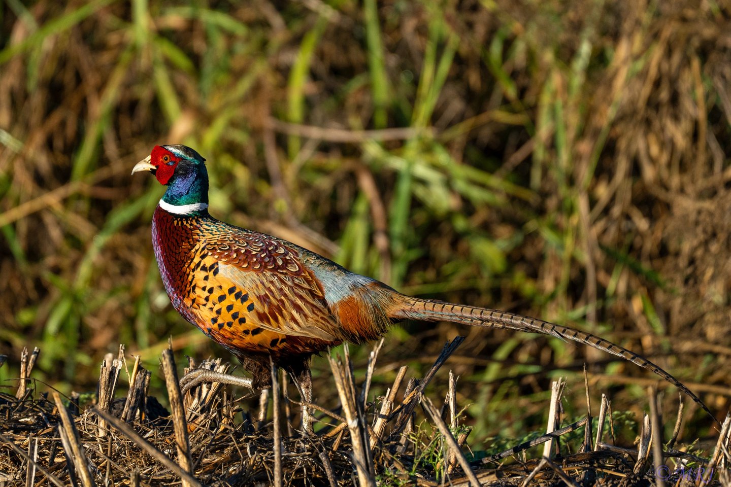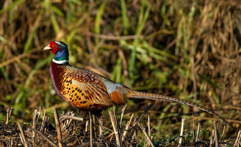 Even though Staten Island is widely known as a vital winter haven for sandhill cranes and countless other migratory birds, this incredible moment with a vibrant Ring-necked Pheasant was the highlight of our visit! We spotted this colorful guy posing along the roadside of the 9,200-acre tract of farmland and wetland in San Joaquin County. It was a beautiful splash of color against the dry grasses.