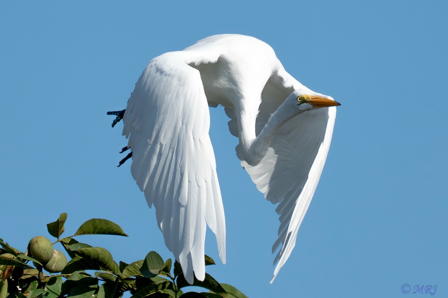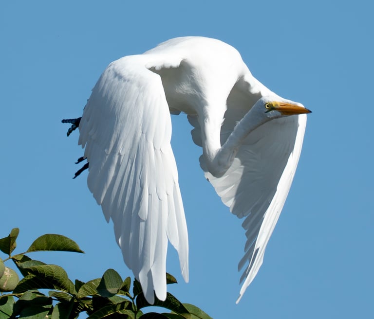 A breathtaking moment captured at Isenberg Sandhill Crane Reserve as a Great Egret launches into flight. Its pristine white wings are beautifully spread, contrasting with the vibrant blue sky and the green of the foliage below. The elegant curve of its neck and focused expression conveys the grace and power of this magnificent bird taking to the air.