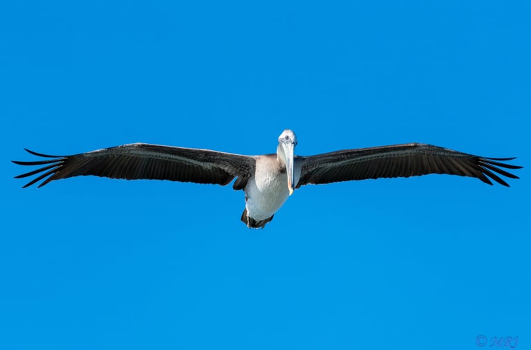 This head-on shot was captured while enjoying the paved walking trail at Loch Lomond Marina in San Rafael. The trail offers outstanding views and is a fantastic location for bird photography. We were lucky enough to spot this magnificent Brown Pelican flying right toward us! Its massive wingspan is completely extended, showcasing the intricate detail of its dark feathers against a brilliant, unbroken azure sky—a powerful and dramatic capture of this iconic coastal flyer soaring effortlessly overhead.