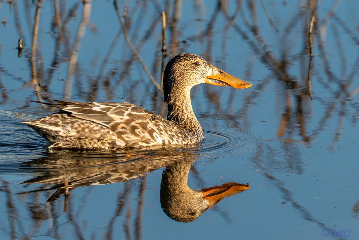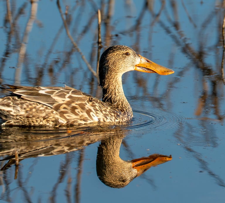 A female Northern Shoveler glides through the calm waters of the Sacramento National Wildlife Refuge, captured during a serene afternoon on the auto tour route. The low sun highlights the intricate patterns of her plumage and the distinct, spatula-shaped bill that defines the species. Her clear reflection in the blue water adds a sense of stillness to the scene, showcasing the quiet beauty of California’s wintering waterfowl in their natural habitat.