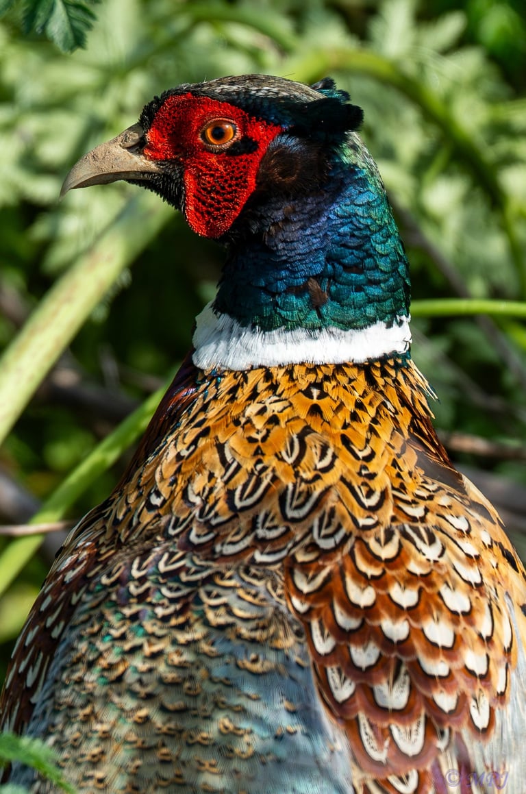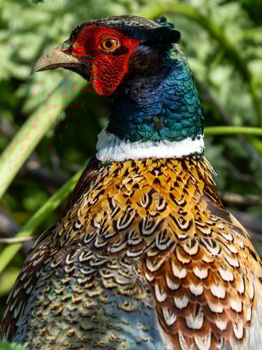 Spotted this vibrantly colored Ring-necked Pheasant along the auto tour route at the Sacramento National Wildlife Refuge. While these birds are often heard "crowing" in the distance or seen scurrying into the brush, it’s rare to get such a clear, detailed look at their intricate feather patterns. The contrast between the deep iridescent greens, the bright white collar, and the fiery red wattles is truly a photographer's dream. It’s a wonderful reminder that the refuge holds much more than just migratory waterfowl; there is beauty tucked into every corner of the upland habitat.