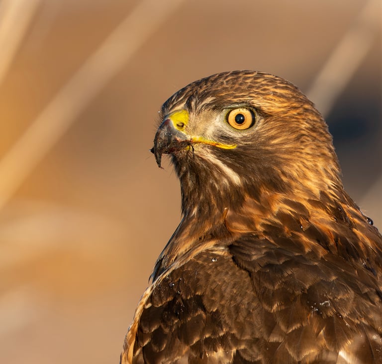 Oregon finally decided to trade the clouds for a few days of brilliant sunshine, so we packed up and headed straight for the Lower Klamath Basin. It turned out to be the right call—the sky and the poles were absolutely teeming with birds of prey. While navigating the auto tour route, we spotted this magnificent Red-tailed Hawk perched on a pole just a few feet from the vehicle. We crept up at a snail's pace, trying our best not to disturb its hunt. To our surprise, it stayed perfectly still, allowing us to capture this intimate, high-detail portrait.